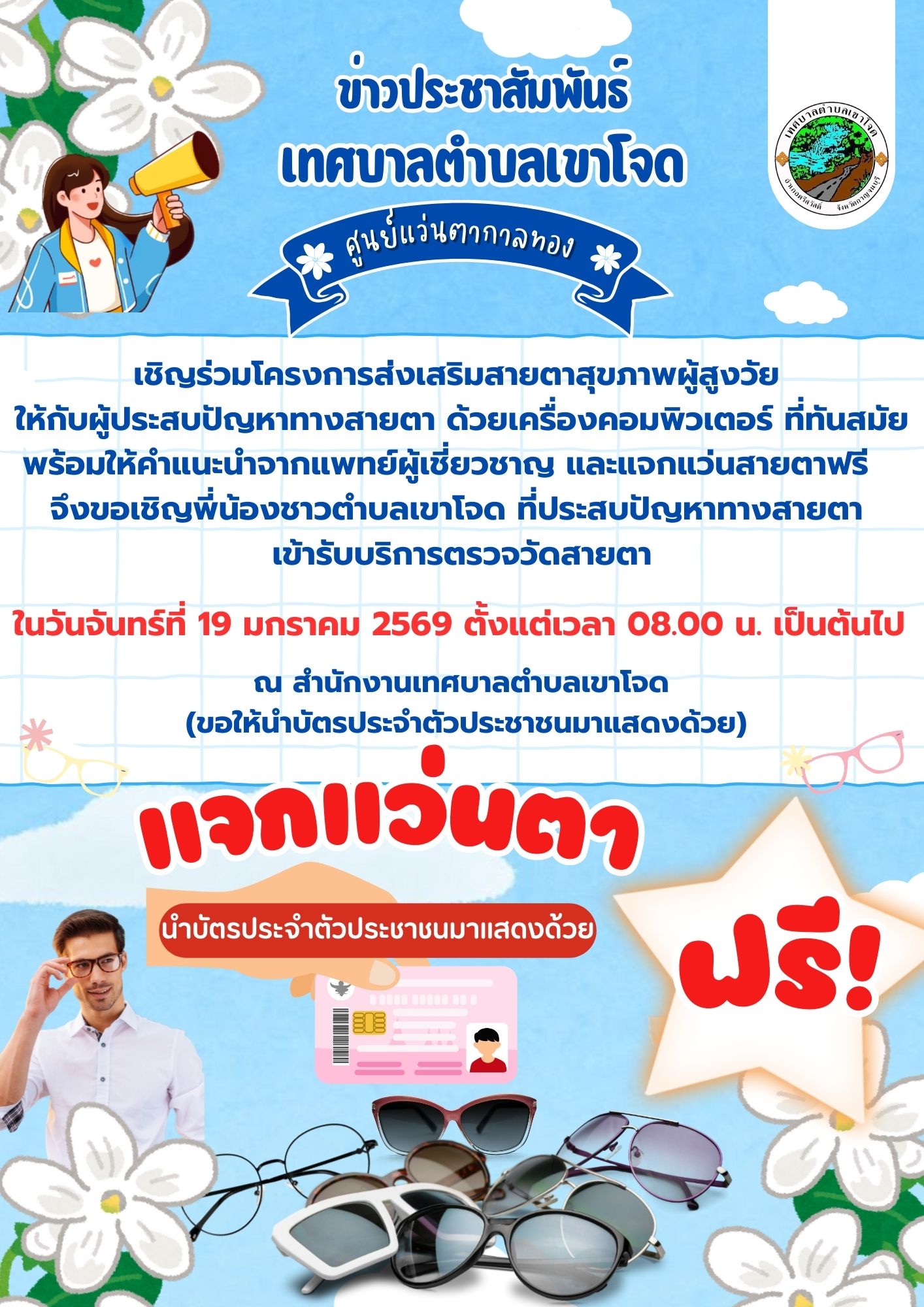 ด้วย ศูนย์แว่นตากาลทอง ร่วมกับเทศบาลตำบลเขาโจด จัดโครงการส่งเสริมสายตาสุขภาพผู้สูงวัย ให้กับประชาชนที่ประสบปัญหาทางสายตา ด้วยเครื่องคอมพิวเตอร์ที่ทันสมัย พร้อมให้คำแนะนำจากแพทย์ผู้เชี่ยวชาญ และแจกแว่นสายตาฟรี จึงขอเชิญพี่น้องชาวตำบลเขาโจด ที่ประสบปัญหาทางสายตา เข้ารับบริการตรวจวัด ในวันจันทร์ที่ 19 มกราคม 2569 ตั้งแต่เวลา 08.00 น. เป็นต้นไป ณ สำนักงานเทศบาลตำบลเขาโจด (ขอให้นำบัตรประจำตัวประชาชนมาแสดงด้วย)